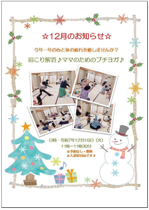 ☆予約なし・無料・入退室自由今年一年の心と体の疲れを、リフレッシュ♪お子さんは、スタッフが見守ります♪お気軽に、ご参加くださいね♪