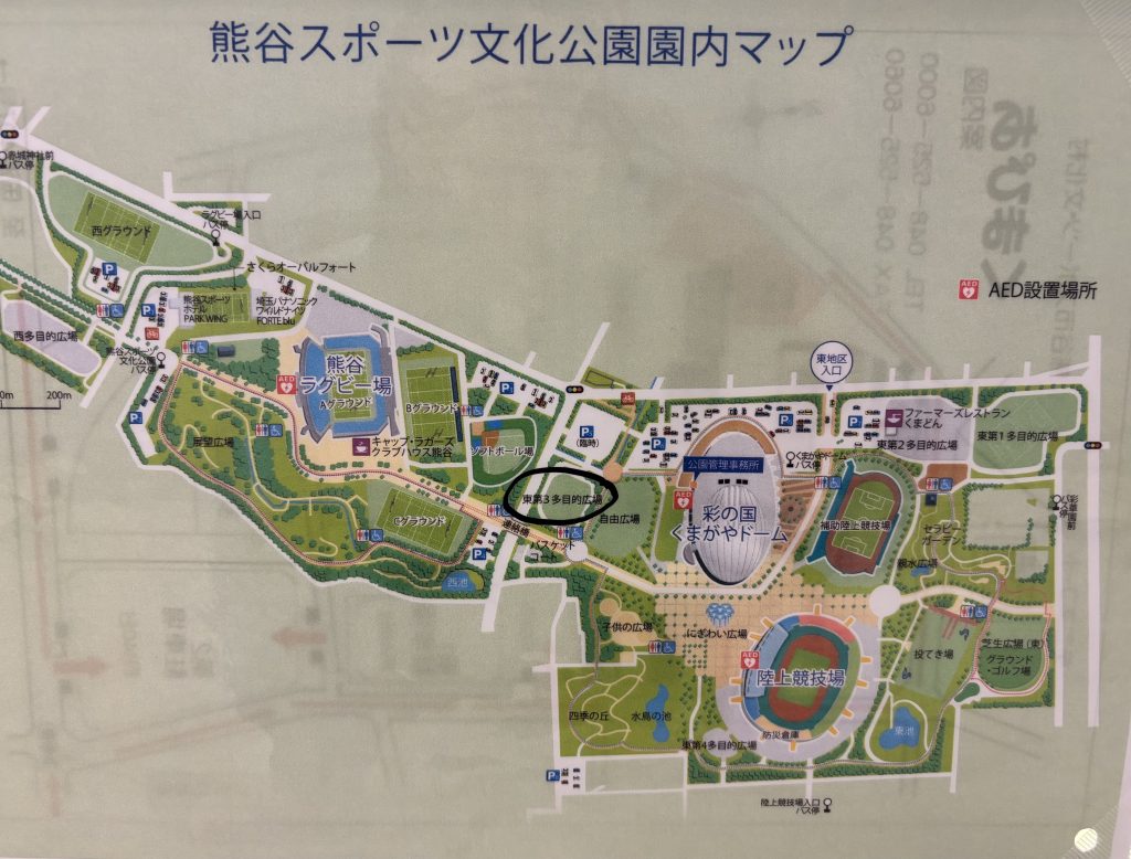 みなさん、熊谷スポーツ文化公園・東第3多目的広場に集まれ~🎵駐車場は、P5を利用していただくと一番近いです。