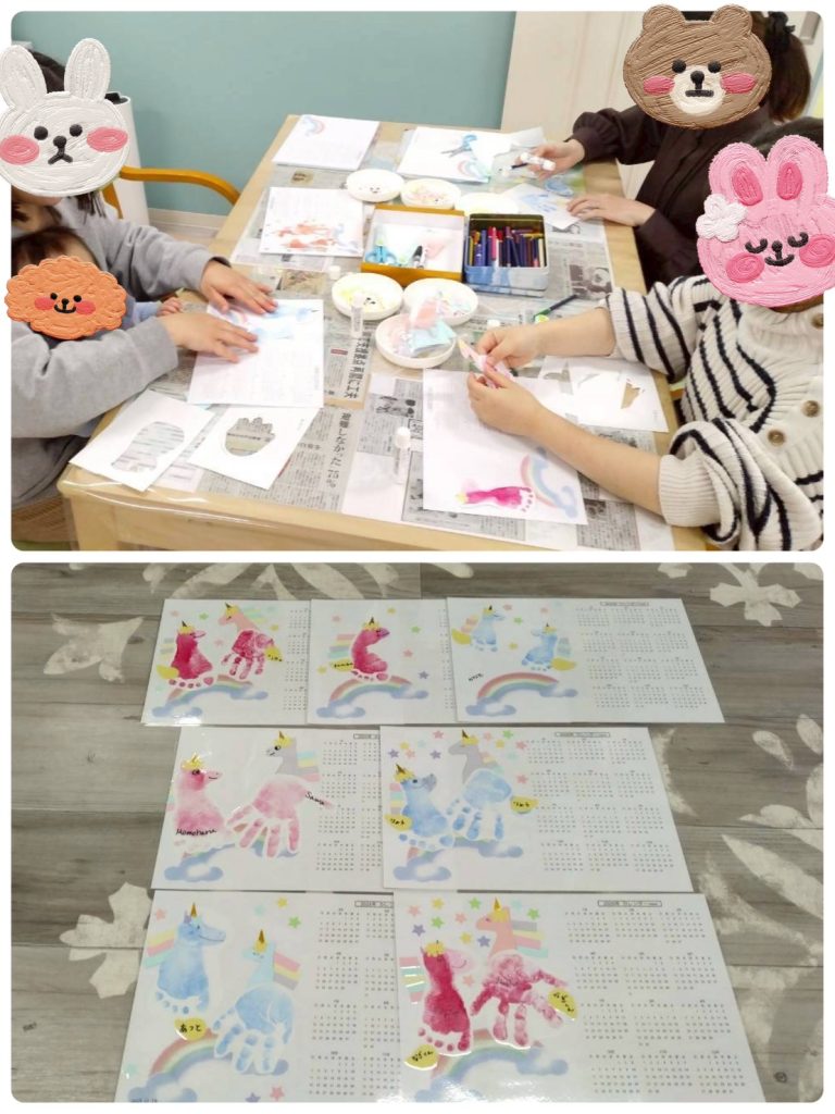 午後は季節の制作。今年も干支のカレンダーです。馬なので可愛いユニコーンにしました。お子さんの手形足型を利用しての作品みんな可愛いくできました。