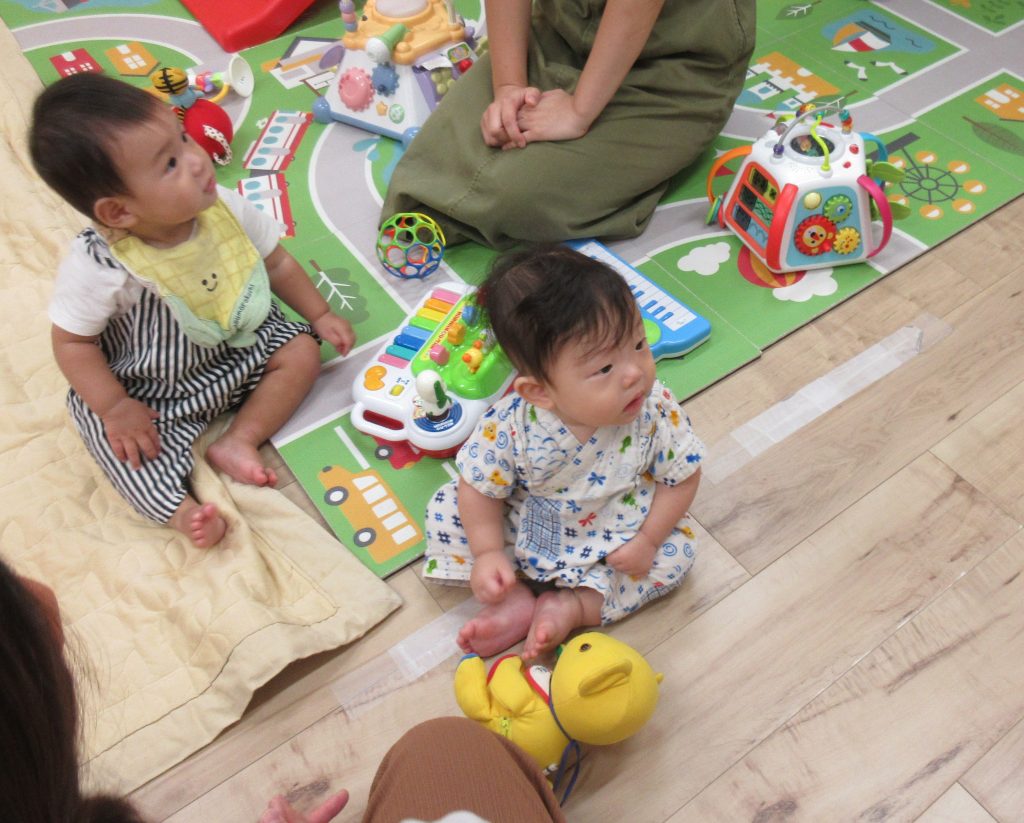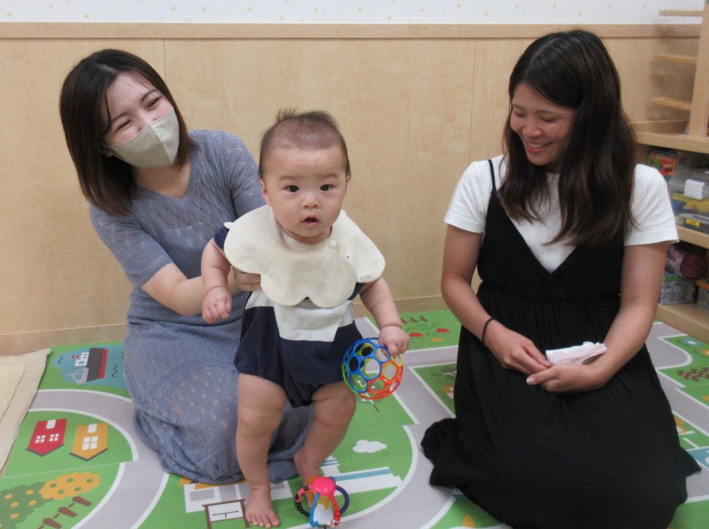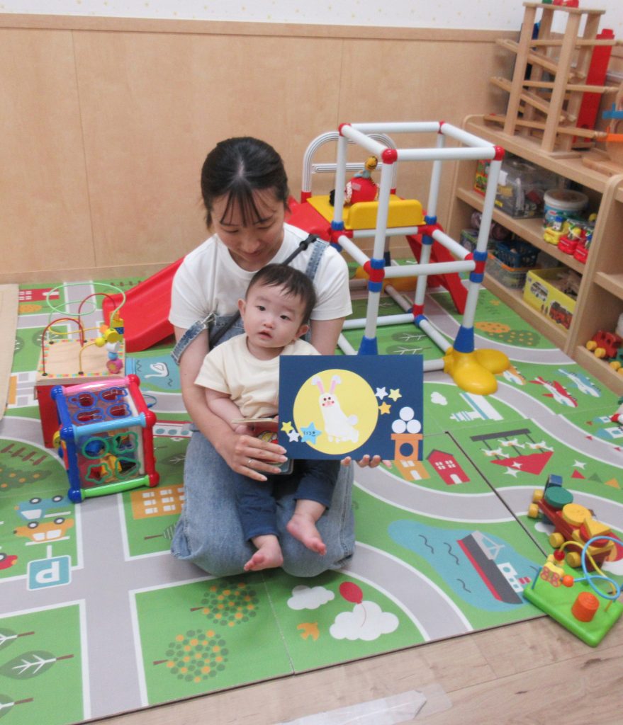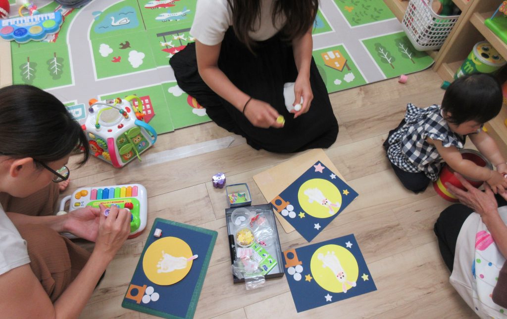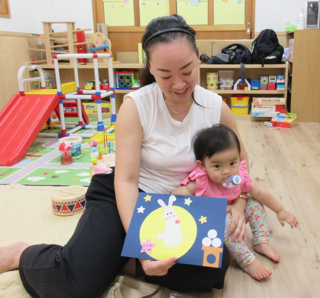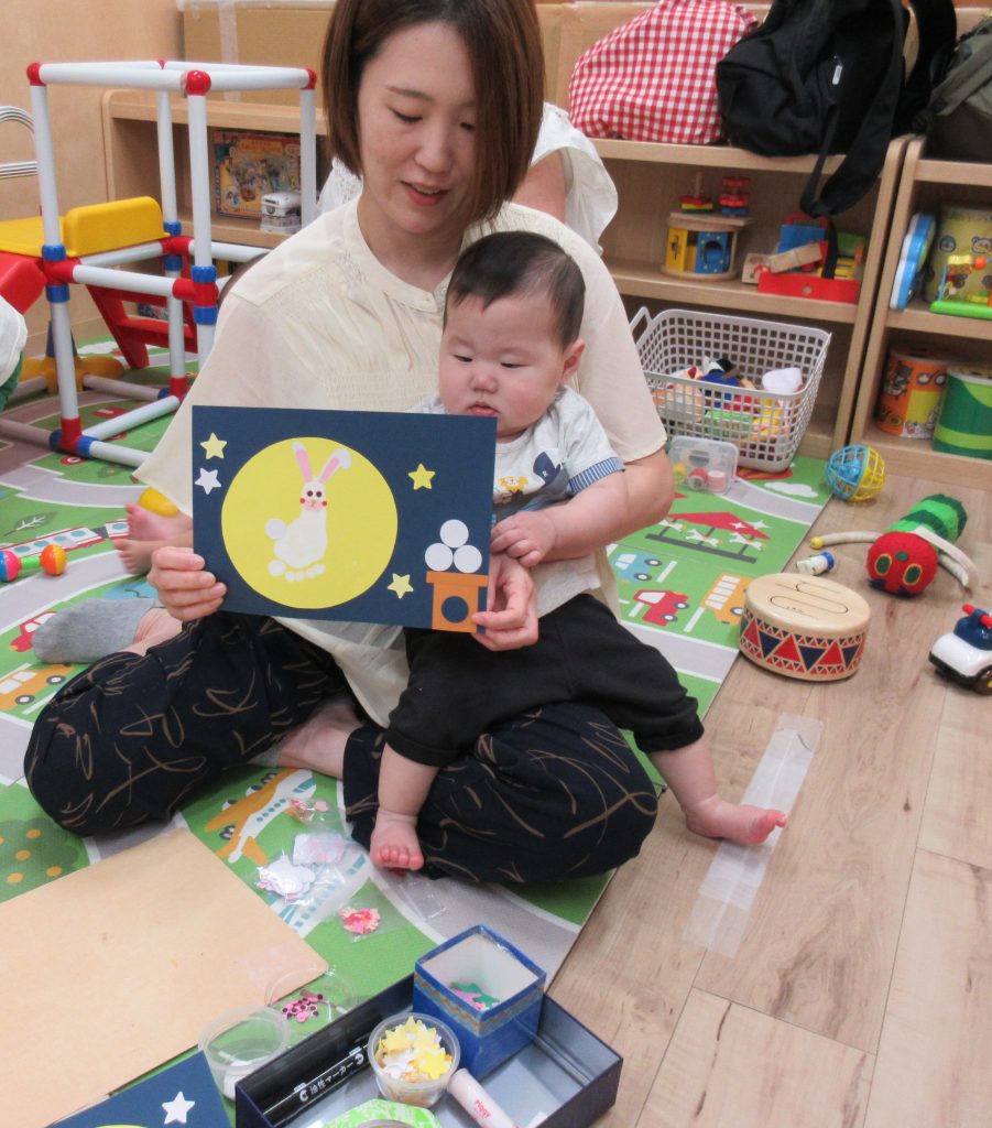 お月見うさぎ、みんなママが制作してると、なにしてるの?不思議な顔してママの持ってるステックのりやマジックなどに、人気集中でした。最初に足型をとる時は泣いたり、嫌がる子、カメラを向けてるとみんな(*^^*)ニコニコでご機嫌でした。