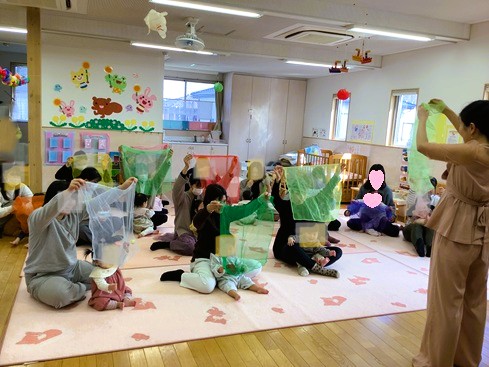 スカーフを広げながら親子で楽しみました♪