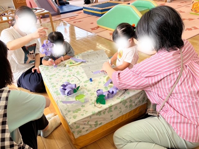 親子で協力をしたり、側でお子さんに応援されたりしながら糊で輪を繋げました。
