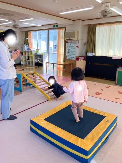 サーキットではお母さんにそばで見守ってもらいながら、トンネルをくぐり、平均台を渡り、トランポリンでジャンプをし、巧技台へ、を行いました。お友だちとの順番も守りながら楽しめましたね。
