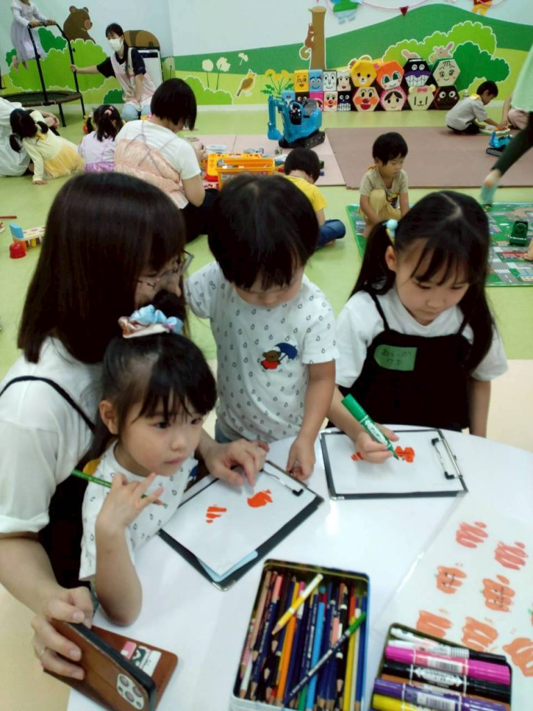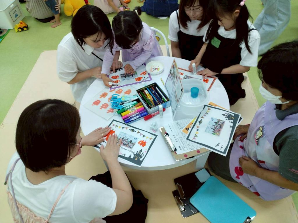 みんなで制作をしましたが、「オレはやりたくない~」と話すお子さんの一人称にスタッフも成長を感じて「わあー!」と感動したり、ママ達はお互いのお子さんに「大きくなったねー‼」と驚き合ったり、笑顔あふれるひと時となりました♪