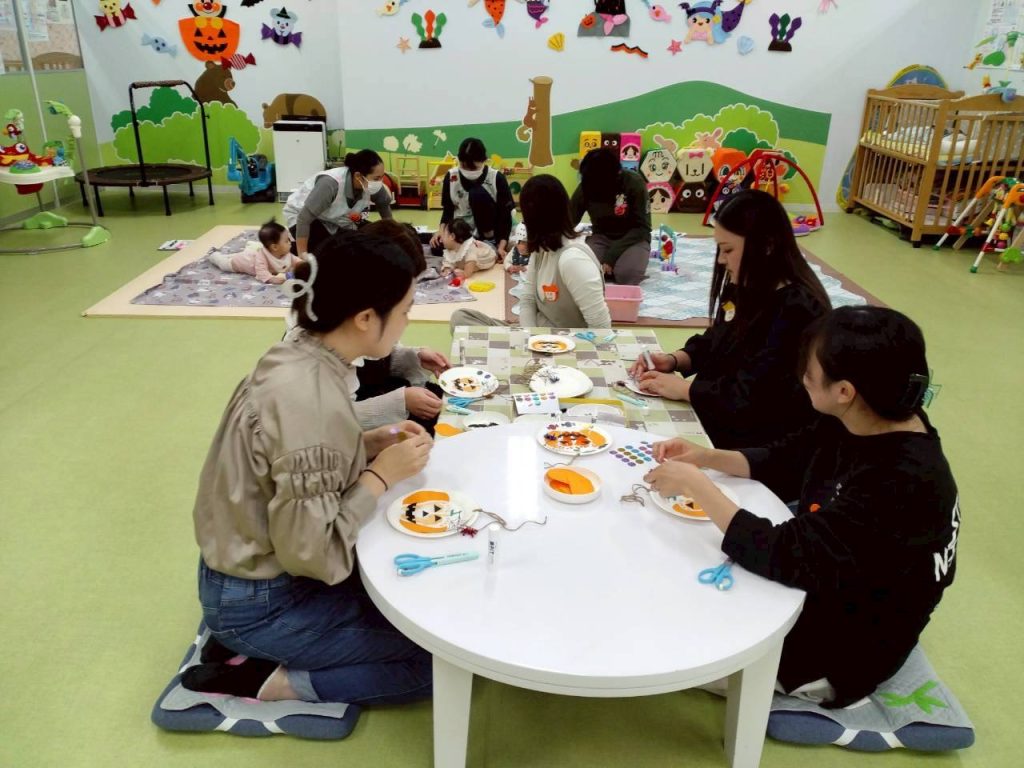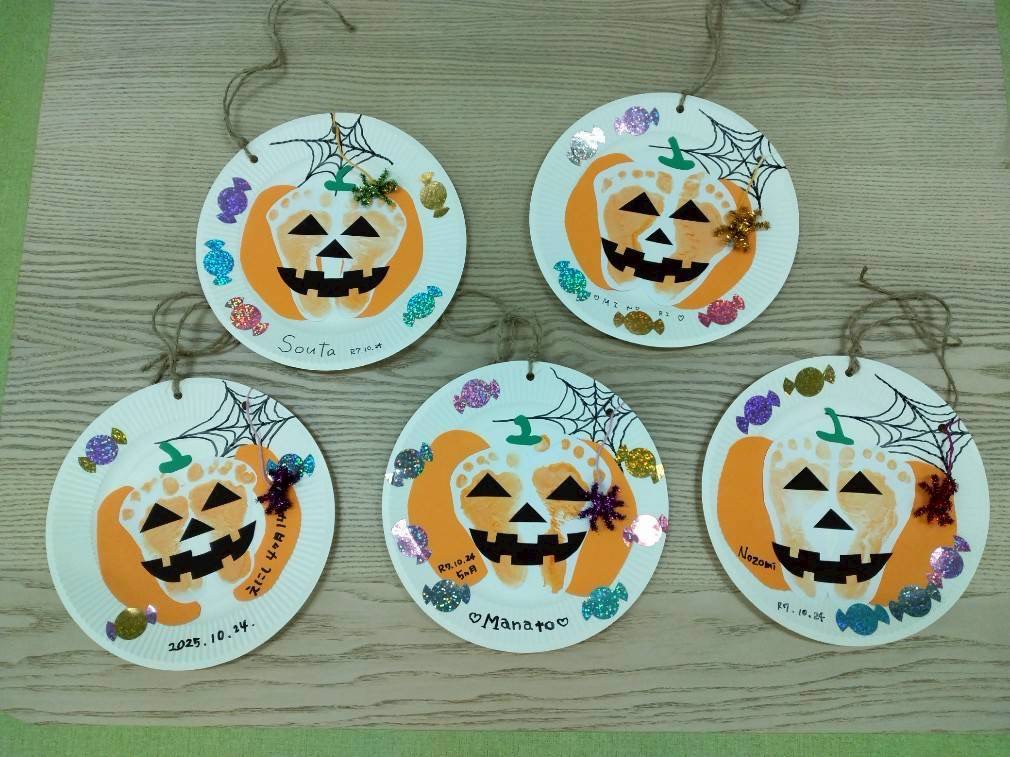 緊張して参加した「くまっこサロン」の後の再会は、自然とお話も弾んでいます。お子さんはスタッフが見守りする中、ハロウィンの足型制作!!記念にお持ち帰りしてもらいました。